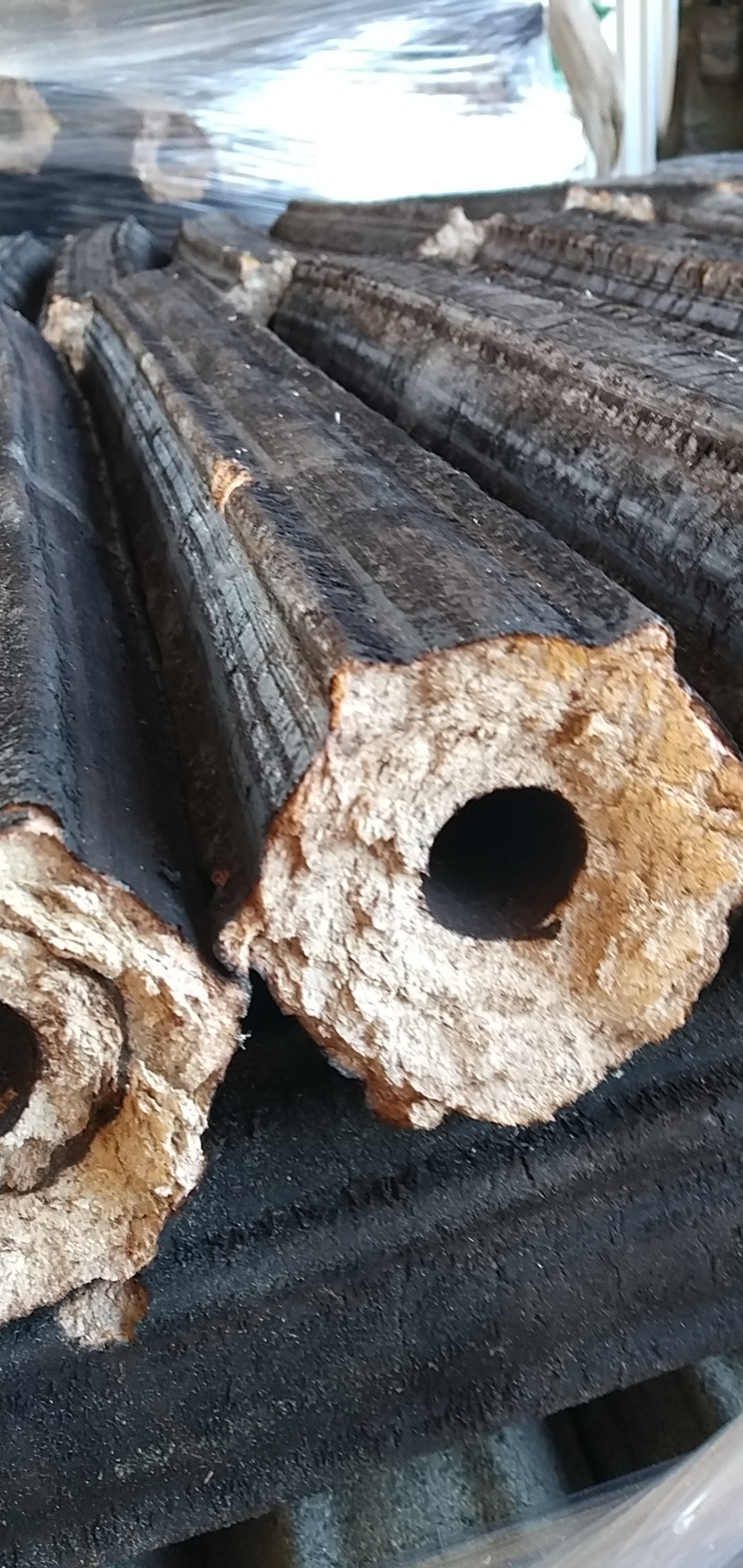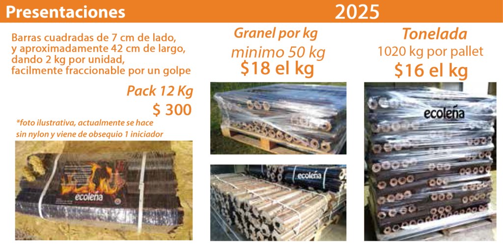 Son 100% naturales y ecológicas, ya que están hechas de solamente de aserrín,dandole una segunda utilidad al arbol tratando de reducir la tala para leña. Los mismos son molidos, secados con un bajo porcentaje de humedad y luego compactados para formar briquetas de 2 kg. y unos 45 cm de largo.